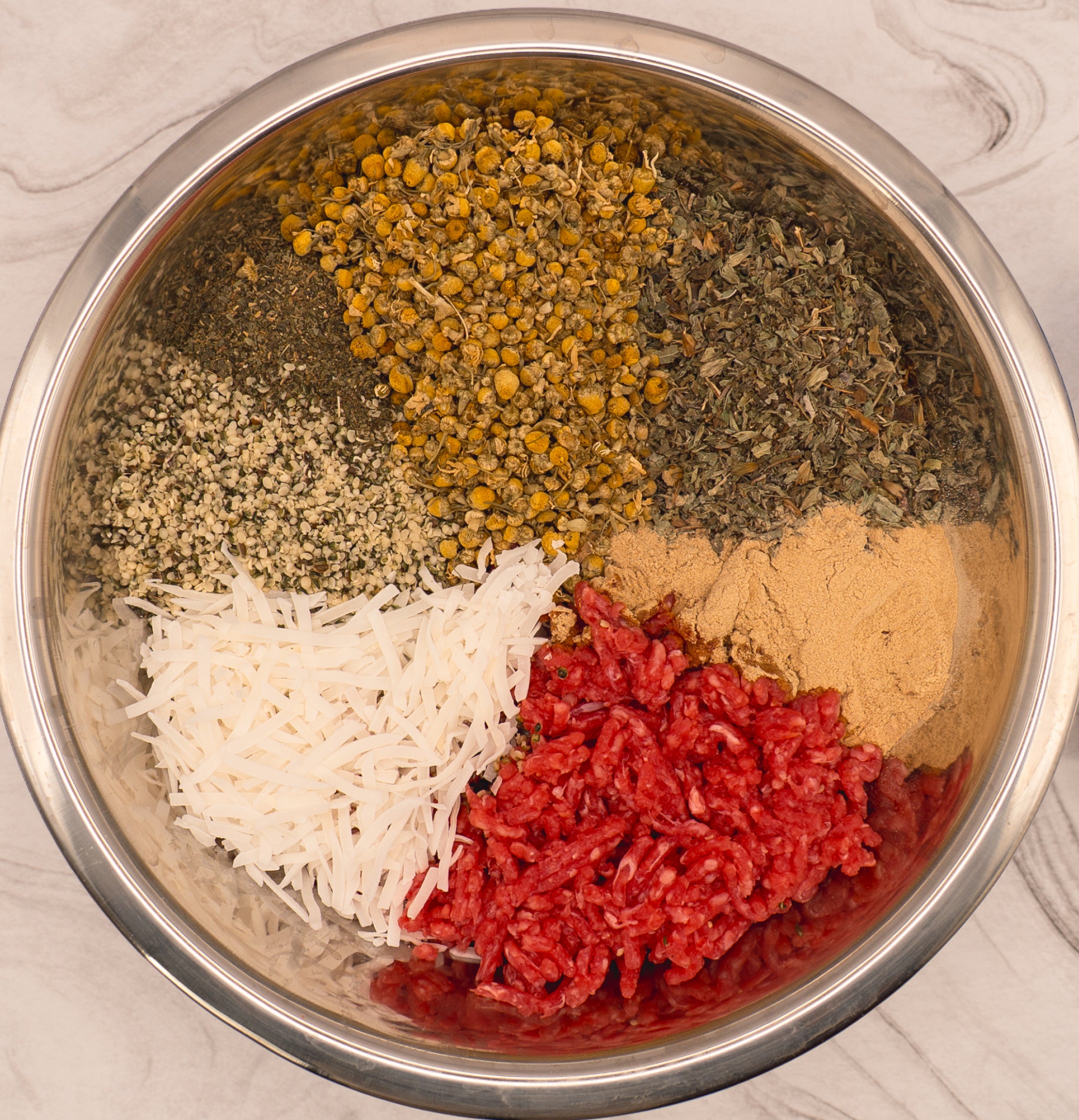 INGREDIENTS: Ground Beef, Hemp Seeds, Coconut, Chamomile, L-Theanine, Lemon Balm, Ashwagandha